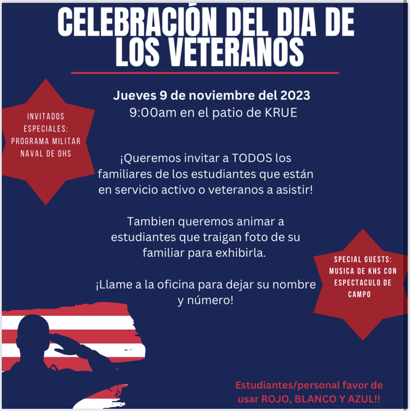 We would like to invite ALL students' family members who are active service or veterans to attend. This year's special guests will be DHS NJROTC Program and KHS Band will be here to do their field show performance! Students please wear RED, WHITE, and BLUE!